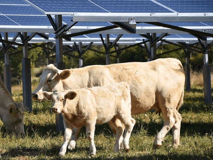 Après avoir étudié la topologie des terrains, Ether Energy a décidé d’installer des panneaux solaires avec la technologie des « tracker » (panneaux ajustables en fonction de la position du soleil). Cette technologie rend la production d’électricité compatible avec l’activité des bovins et le passage des engins agricoles.